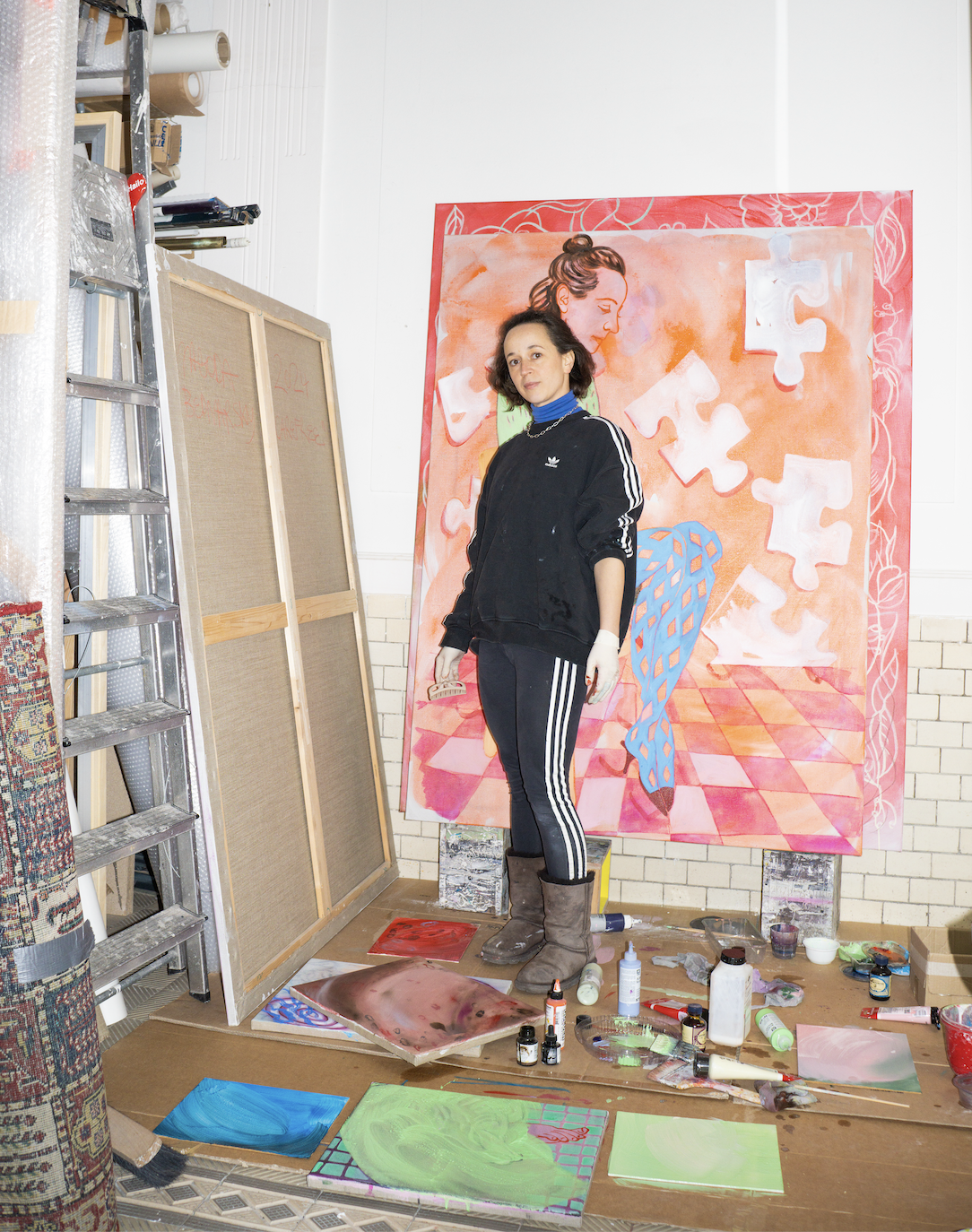 Throughout her practice, themes of self-image, wellness culture, motherhood, voyeurism, and femininity often intersect with design elements and theatrical fragments that suggest incomplete or imagined narratives. Across this new body of work, Bednarsky transforms the apparent excess of contemporary visual culture into a painterly language of repetition, variation, and reinvention. At once playful and analytical, the works probe the potential of images and their role in the construction of identity, while remaining infinitely open to reinterpretation.